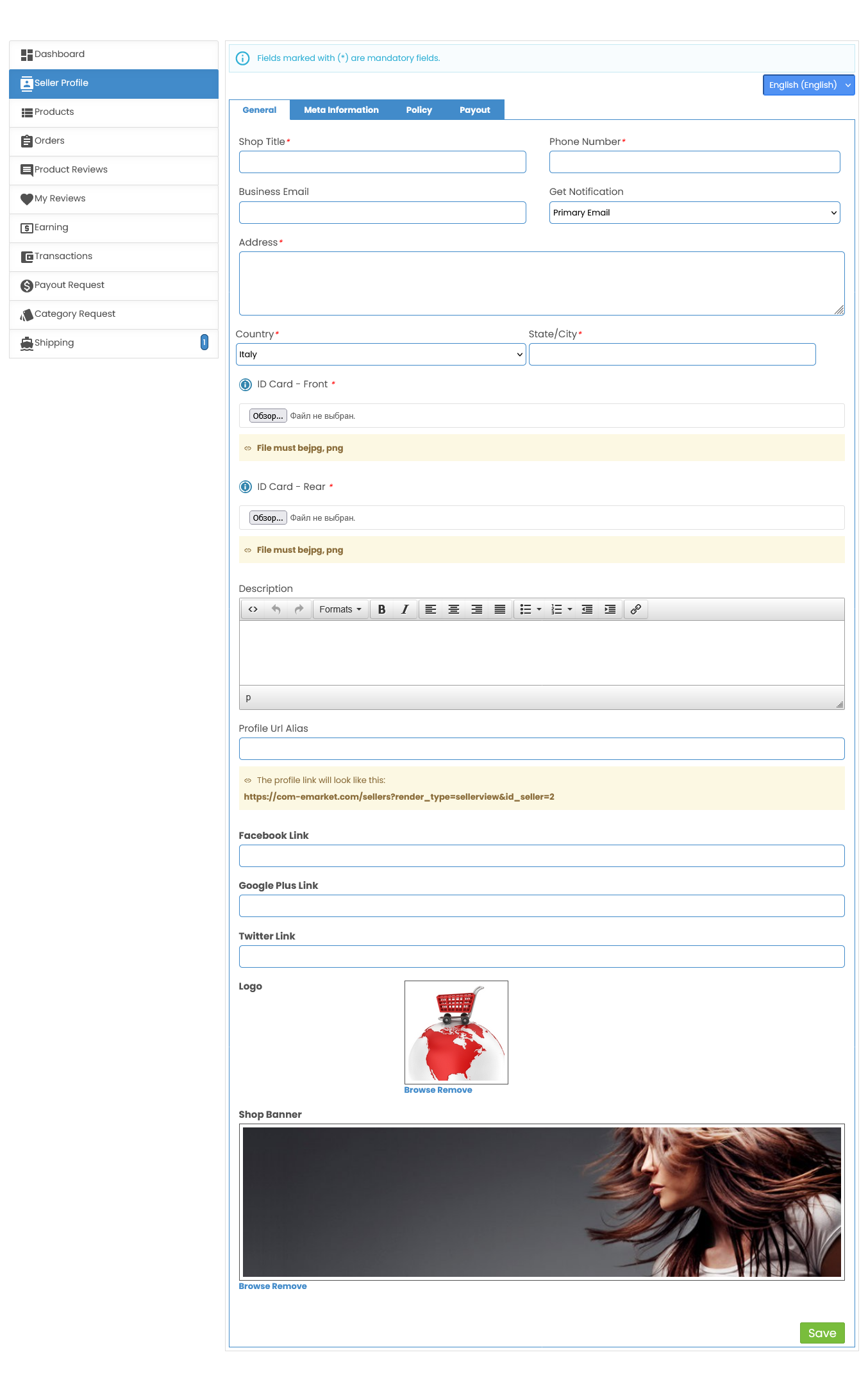 In the Seller Profile section, you can complete and personalize your shop information. Here are the fields you'll need to fill out to ensure a fully set-up seller profile: