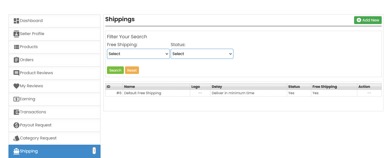 In the Shippings section of your Seller Dashboard, you can review and manage all available shipping options for your products. This area displays a list of your existing shipping methods, showing details like: